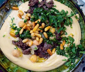Divide the hoummos between six shallow serving bowls, leaving a slight hollow in the centre of each. Spoon the warm kawarma into the hollow and scatter with the reserved chickpeas. Drizzle with the lemon sauce and garnish with chopped parsley and toasted pine nuts.