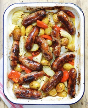 Place all ingredients (except the wine) in a roasting tin. Toss in the oil and season with salt and pepper. Keep in one layer, don't cover the sausages.