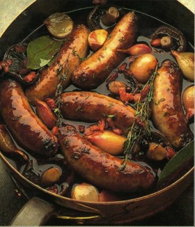Put the sausages back in, with the garlic, bayleaf, thyme and seasoning. Cover and simmer very gently for 30 minutes.