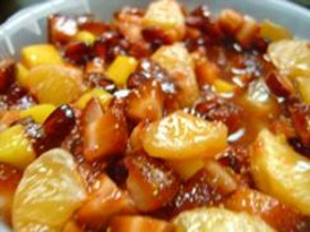 In a deep bowl, combine the lychees, sliced pineapple, sliced orange, dates and pecans.